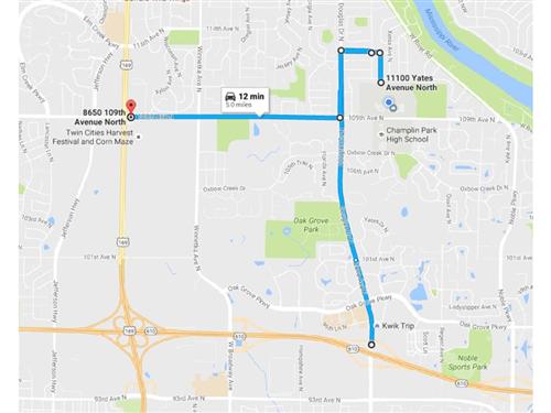 From 610, take the exit for Zane Ave and head north. Zane becomes Douglas Drive. Continue past 109th Ave N, and take a right on 113 Ave N. One block past the stop sign, take a right on Yates and follow Yates into the north parking lot.