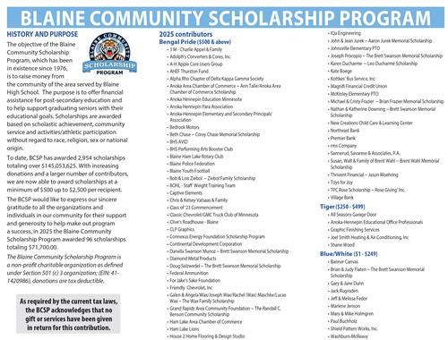The Blaine Community Scholarship program awards scholarships to BHS seniors each year. Students become eligible for numerous scholarships from local businesses and organizations through completion of this one application. The application for this year's program will be available on the BHS website from March 6 - April 11, 2025. Applicants who are selected for scholarships are required to attend the award ceremony being held in the evening on Wednesday, May 7, 2025. Recipients will be notified by May 2, 2025.